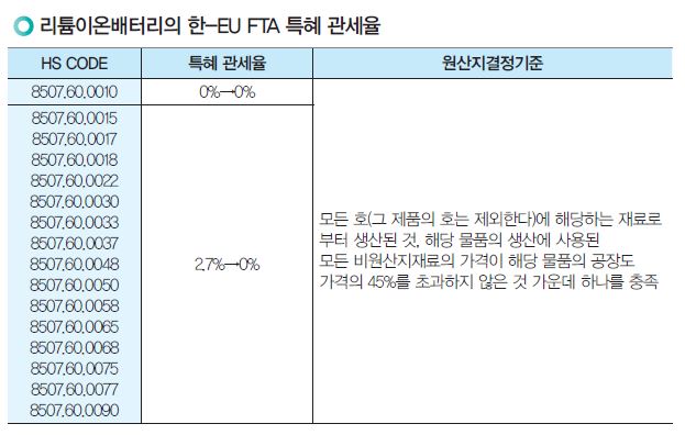 HS코드 제8507의 한-EU FTA 원산지결정기준은 ▲모든 호(그 제품의 호는 제외한다)에 해당하는 재료로부터 생산된 것 ▲해당 물품의 생산에 사용된 모든 비원산지재료의 가격이 해당 물품의 공장도가격의 45%를 초과하지 않은 것 가운데 하나를 충족하면 된다. 즉, 4단위 세번변경기준(CTH)과 부가가치기준(MC45) 중 하나에 해당하면 된다.