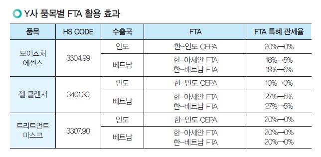 컨설턴트가 회사를 방문해 현황을 살펴본 결과, Y사는 트리트먼트 마스크, 에센스 등의 제품에 대해 한-중 및 한-아세안(ASEAN·동남아시아국가연합) FTA 인증을 취득한 상태였으나, 인증 기간 5년이 곧 만료될 예정이었다. 인증을 취득했어도, 화장품 제조업의 특성상 제품별로 다양한 규격이 존재해 규격별 원산지 판정에 애로를 겪으면서 활용도 또한 높지 않았다.